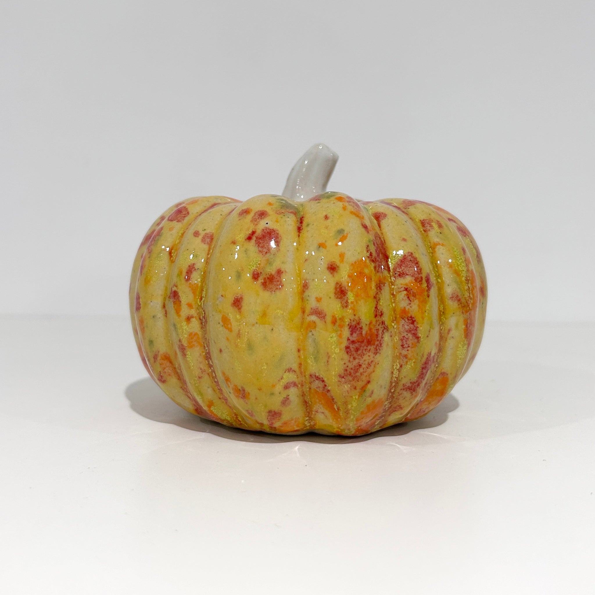 Handmade ceramic pumpkin glazed in sunburst with a white stalk.