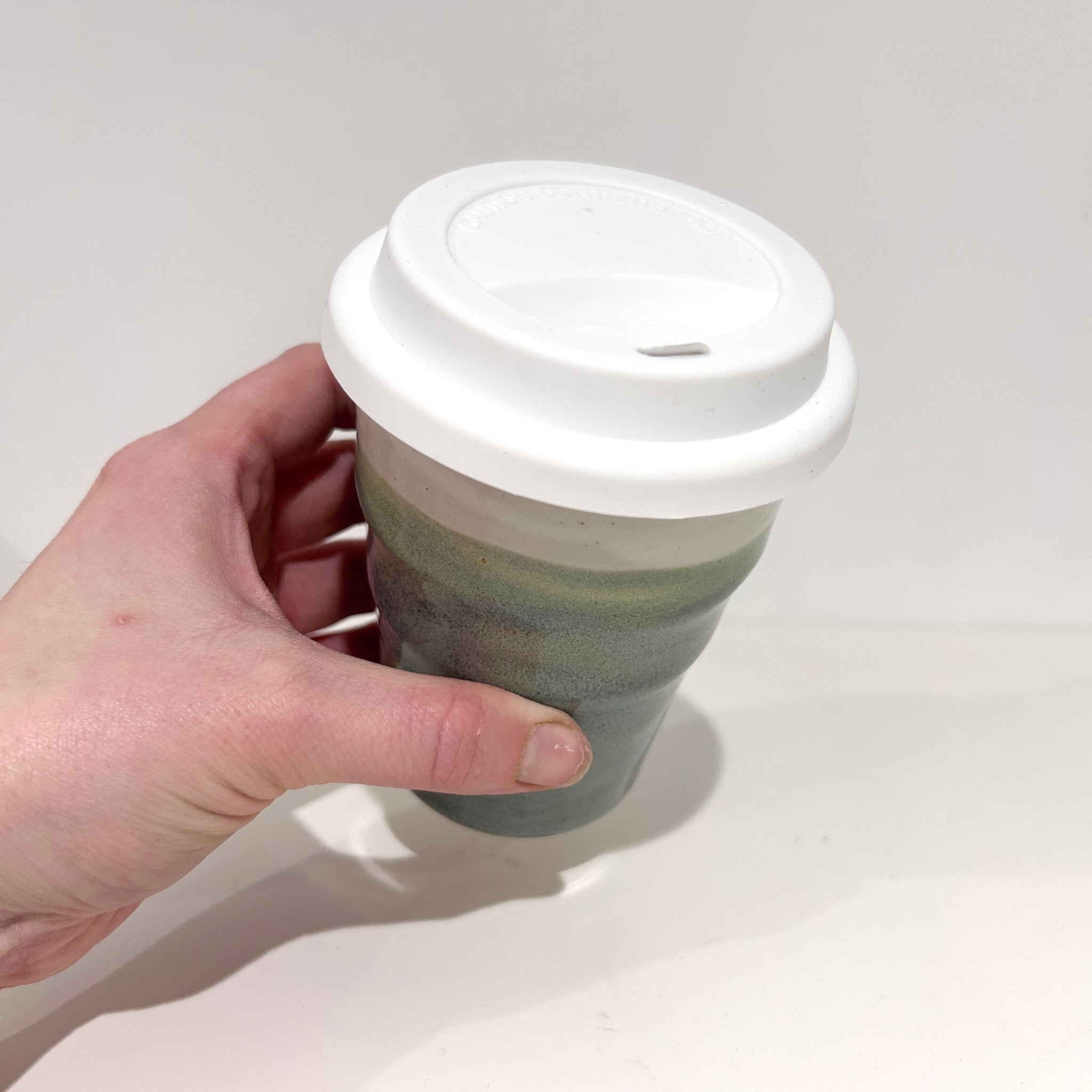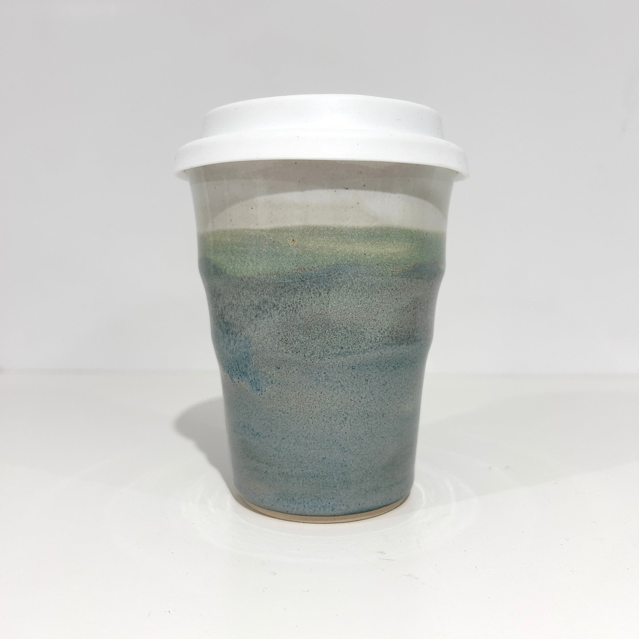 Handmade ceramic travel cup glazed in mountain fog.